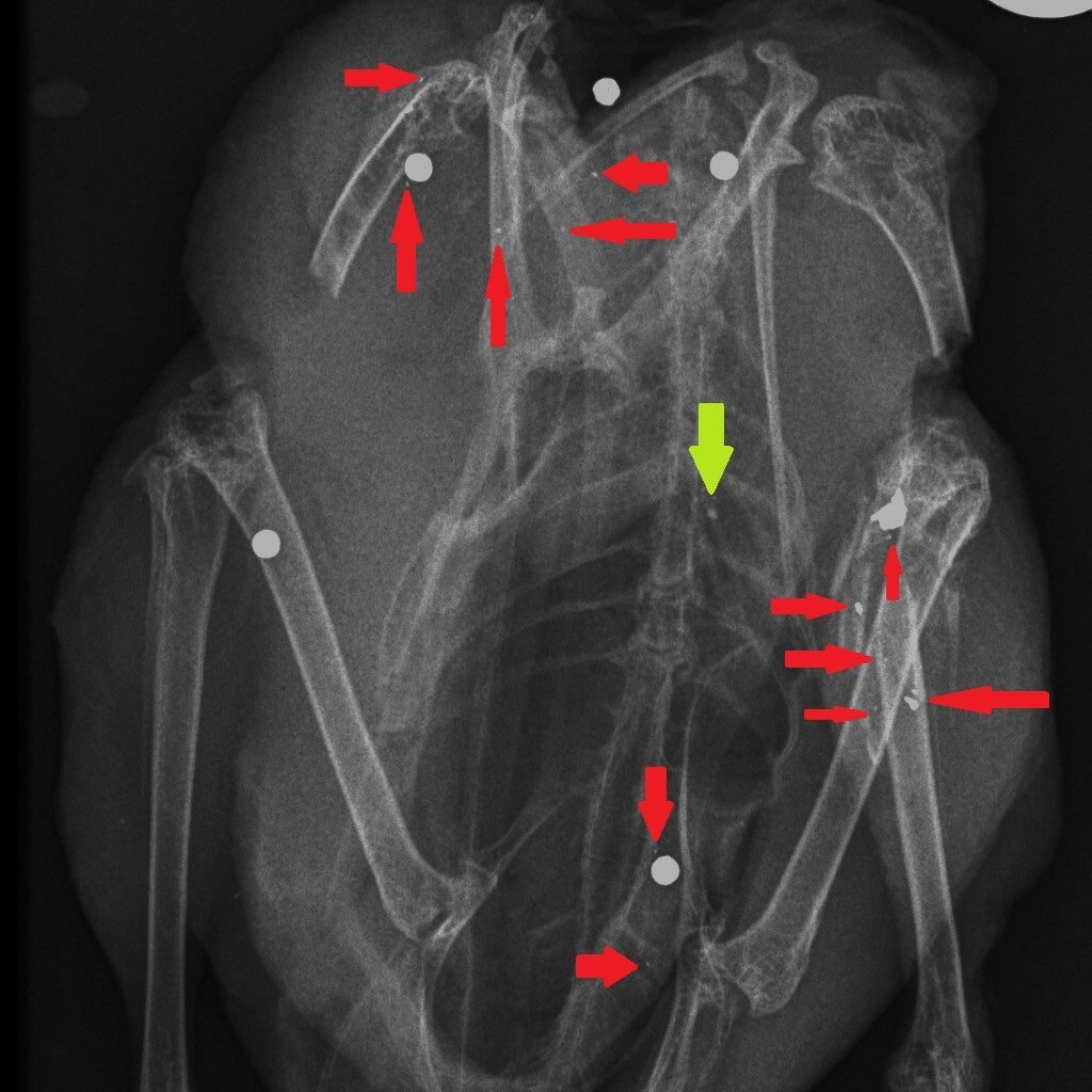 How could we reduce the risk of exposure to lead in game meat? It’s simple – stop shooting lead ammunition into animals that are destined for the human food chain. One of the useful properties of lead is that it is soft and malleable – that’s why, in the past, we have used it widely. But those same physical properties mean that lead passing through the flesh of a shot animal, hitting organs, soft tissue, bones and cartilage, shatters and tiny fragments of lead spread through the body of the animal. Here are three x-rays of shot birds that were bought in butcher’s shops and then x-rayed. The top x-ray is of a partridge and the other two are Red Grouse. Large white circular objects are lead shot. The green arrows point to fragments of bone and the red arrows indicate fragments of lead, from the shot, that have spread through the flesh.