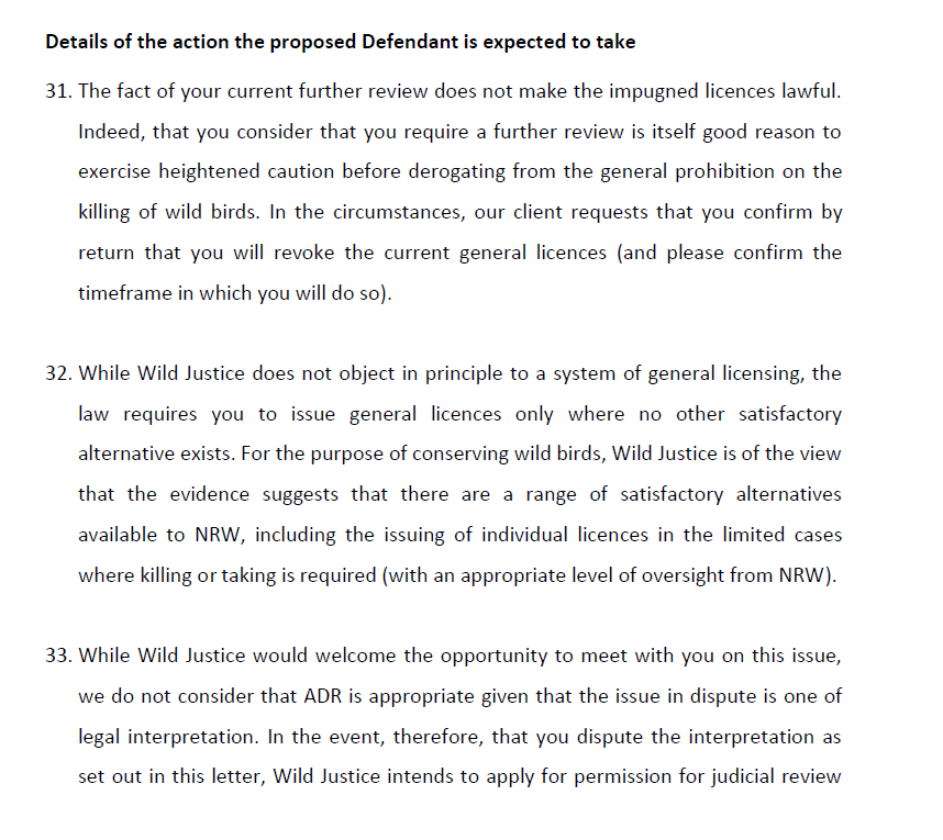 Unless NRW agrees with our legal interpretation then we intend to apply for permission for judicial review of their issuing of general licences. If we do this then we will need to raise funds for such a legal case.