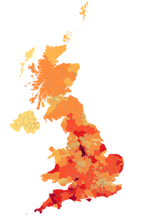 See the map of strength of support by Westminster parliamentary constituency here: