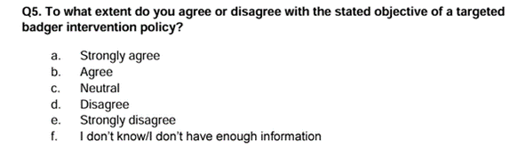 Question 6 – the Defra consultation asks (in its question 5, on p17 of the consultation document) whether you agree with the ‘stated objective’ of a targeted badger intervention policy without stating what the stated objective might be: