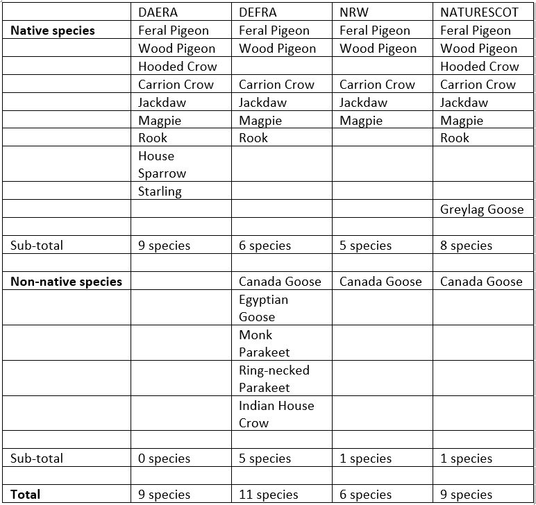 Here are three tables which set out the current position for the three different categories of general licence in each of the four UK nations.